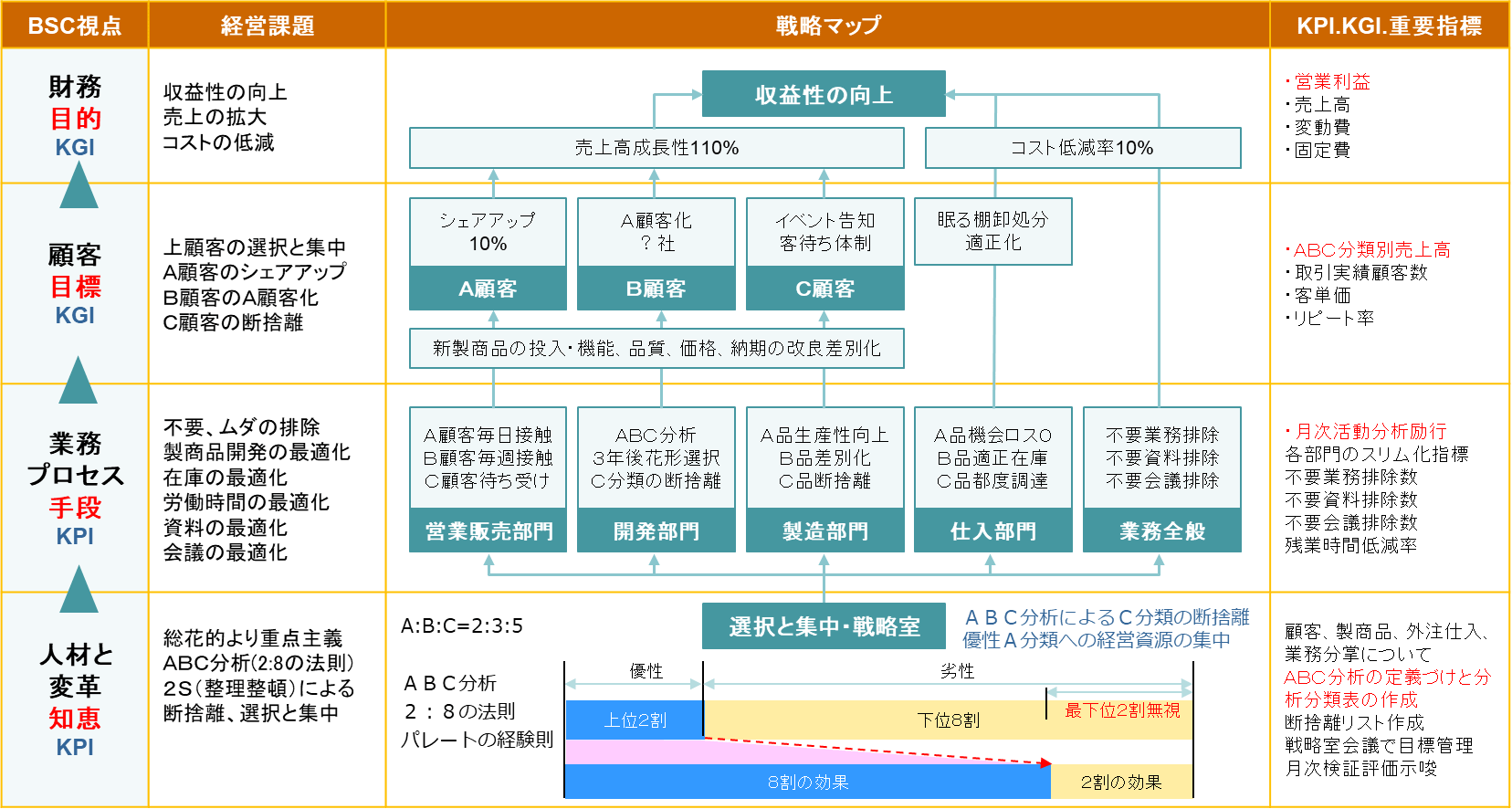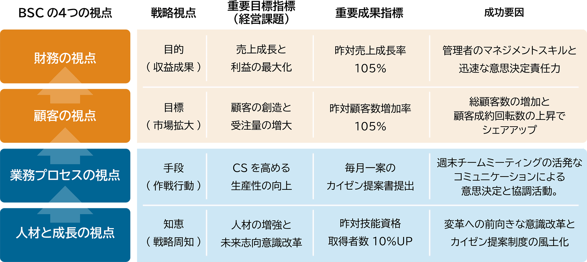 財務業績評価だけに偏った従来の経営管理手法を、「財務」「顧客」「業務プロセス」「人材と変革」の四つの視点に分けて、経営課題、成功要因、評価指標などを設定し、視点間の因果関係から戦略・戦術・作戦行動のバランスを取りながら成功に導く論理的戦略経営管理手法です