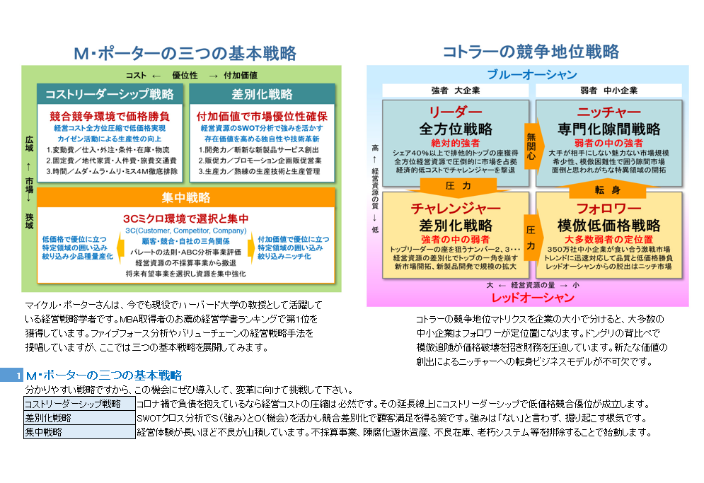 経営計画を「単なる数字の羅列」で終わらせていませんか? 本デジタルブックは、世界的な経営戦略論である**「M・ポーターの三つの基本戦略」と、戦略実行を多角的に管理する「バランススコアカード(BSC)」**を組み合わせた、中小企業のための実戦型計画策定パッケージです。