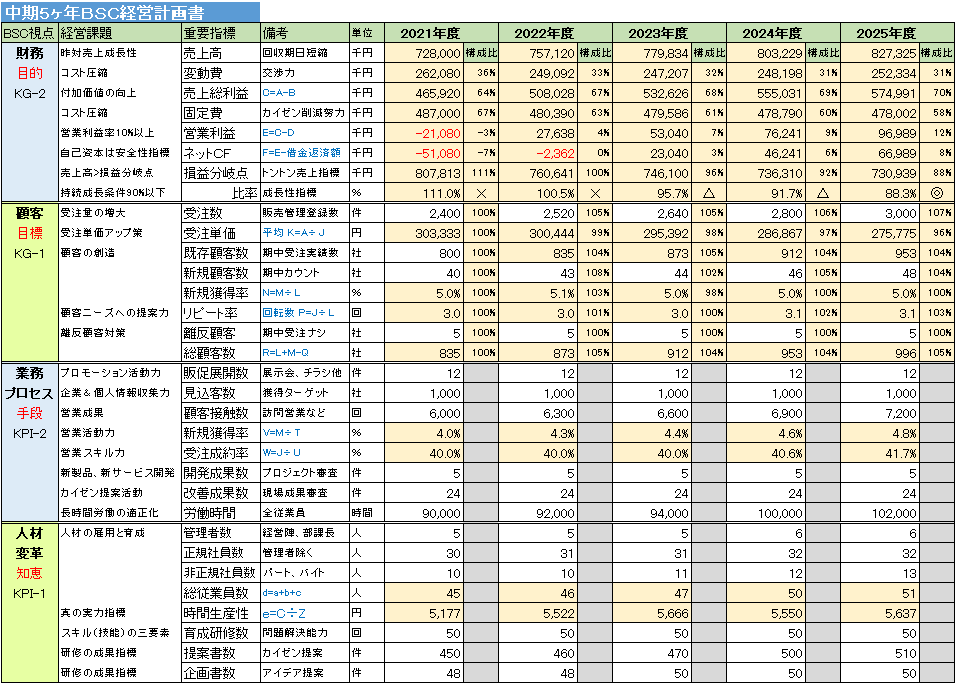 BSC重要指標(KPI)管理:既存顧客数や新規獲得率、時間当たり生産性など、現場が理解できる具体的な指標で5年間の計画を構築。