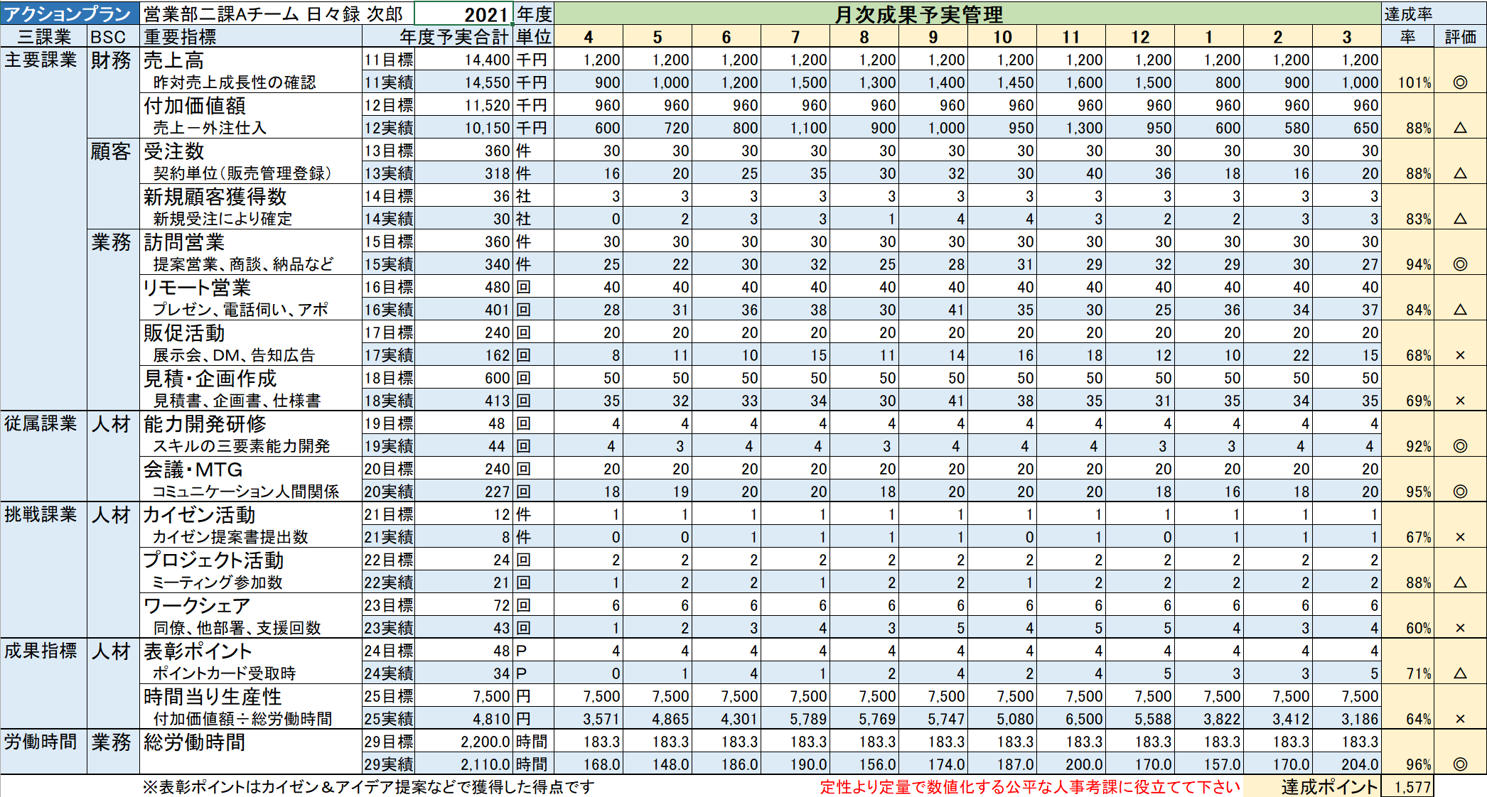 営業職用シート:売上だけでなく、新規獲得率や成約率、顧客接触数など「結果に至るプロセス」を月次で予実管理。